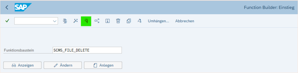 2. Geben sie den Funktionsbaustein „SCMS_FILE_DELETE“ ein und starten Sie den Baustein über das markierte Icon.