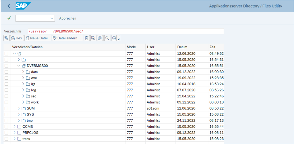 Die Transaktion AL11 wird genutzt, um alle SAP-Verzeichnisse anzuzeigen. Wir können auf die verschiedenen Dateisysteme zugreifen, die definiert sind und mit einem Parameter verbunden wurden. Um Dateien in die Verzeichnisse hochzuladen oder zu löschen, können Sie wie folgt vorgehen: